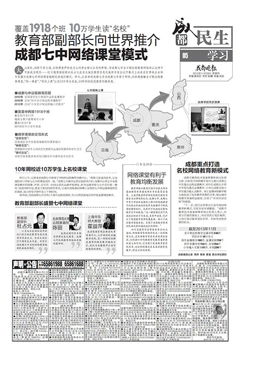 2002年、2005年、2012年和2015年分别与西部最优学校成都七中、成都七中育才、成都市实验小学和成都市金牛区机关第三幼儿园启动了全日制远程教学,实现了学前、小学、初中和高中的优质资源全覆盖,形成完整的全日制远程教学优质教育生态系统。